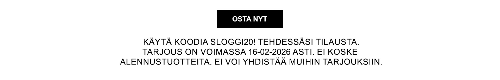 Anna koodi 52605A tilausta tehdessäsi. Tarjous on voimassa 9.2.2026 asti yli 30 euron ostoksissa. Ei koske alennustuotteita eikä voida yhdistää muihin tarjouksiin. Toimi pian – tarjous on voimassa rajoitetun ajan!