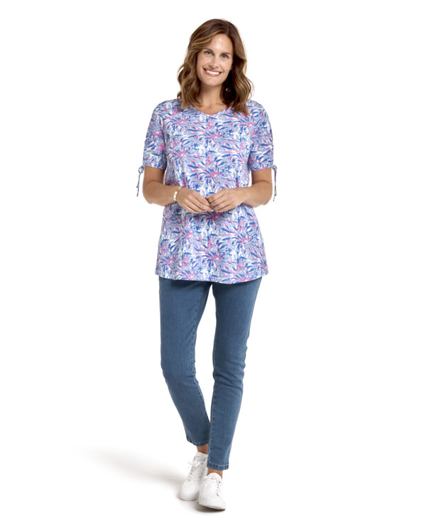 Mukava tunika, josta tulee nopeasti arjen suosikki. Pehmeä trikoo laskeutuu kauniisti ja antaa joustavan istuvuuden, joka tuntuu miellyttävältä koko päivän. Hihoissa on kauniina yksityiskohtana halkiot ja solmittavat nauhat.