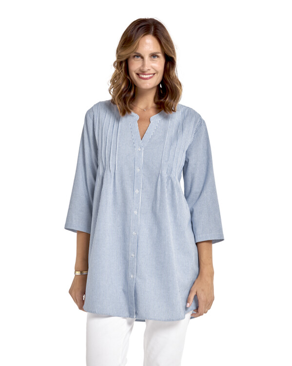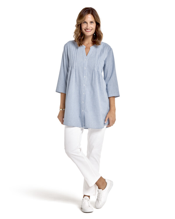 Kevyt tunika pehmeästä ja myötäävästä materiaalista. Edessä on koristeellisia laskoksia, jotka antavat vaatteelle kauniin ilmeen, ja pyöreässä pääntiessä on pieni V-muotoinen halkio. Täysin napitettava malli on helppo pukea ja riisua.