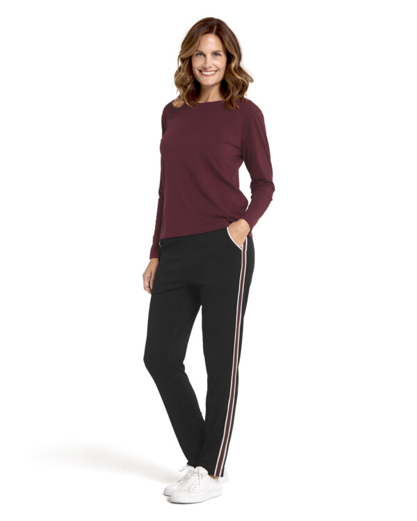 Tyylikkäät vapaa-ajan housut, joissa on sivuraidat ja ihanan joustava materiaali. Joustovyötärö. Taskut edessä. Lahkeen sisäpituus noin 78 cm joka koossa. 65 % viskoosia, 31 % polyesteriä, 4 % elastaania. Hienopesu 40°.