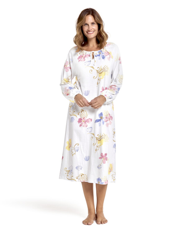 Mukava yöpaita, jossa on pitkät raglanhihat ja pyöreä pääntie solmimisnauhalla. Kaikkien kokojen pituus noin 120 cm olkapäältä mitattuna.
